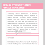 Explore sexual function with our “Sexual Dysfunction in Females Worksheet.” Reflect on symptoms, triggers, thoughts, and emotions related to sexual dysfunction. Not a substitute for professional help, consult a qualified therapist for personalized support and treatment options in addressing these issues.