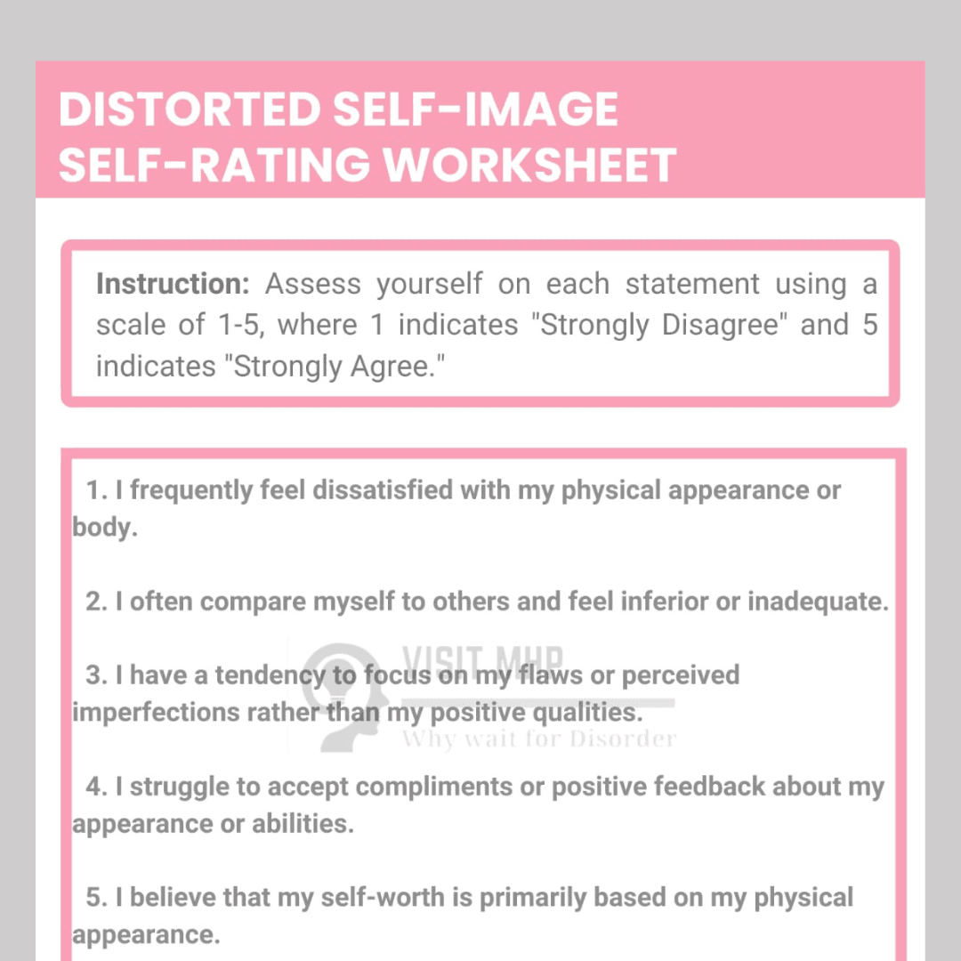 The Distorted Self-Image self-rating worksheet is a tool designed to help individuals assess their perception of themselves. By evaluating thoughts and feelings about their self-image, users can gain insight into potential distortions. While not a replacement for professional guidance, it offers valuable information for therapy discussions.