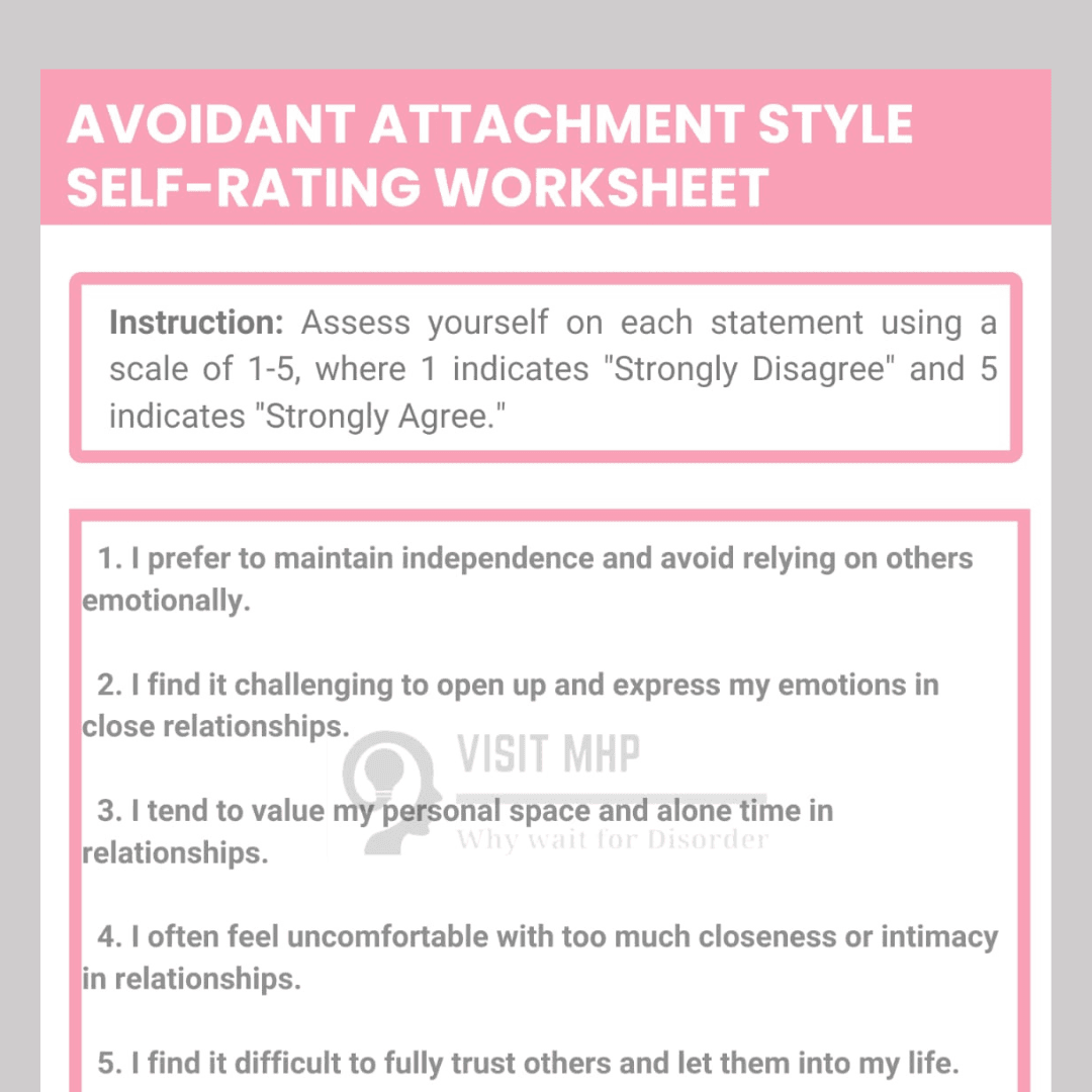 The “Avoidant Attachment Style” self-rating worksheet aids individuals in assessing their tendency to avoid emotional intimacy and closeness in relationships. By exploring thoughts and behaviors associated with avoidance, users gain insight into their attachment patterns. However, it’s essential to recognize that this worksheet is merely a starting point. For comprehensive support tailored to your needs, consulting a mental health professional is recommended.