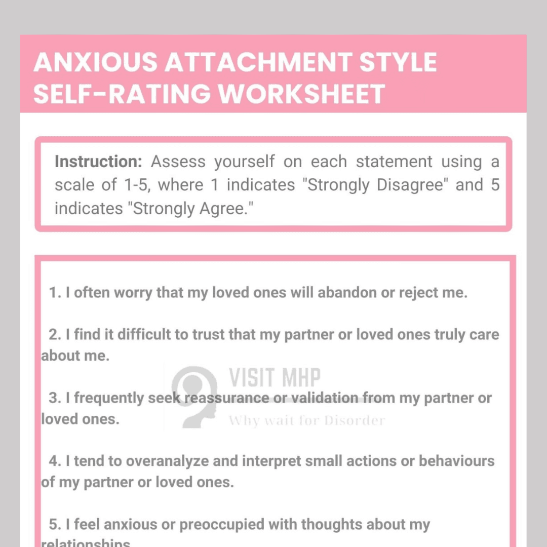 The “Anxious Attachment Style” self-rating worksheet helps individuals evaluate their inclination towards anxiety in relationships, such as fear of abandonment or excessive need for reassurance. By examining thoughts and behaviors linked to anxious attachment, users gain insight into their relational patterns. Nonetheless, it’s essential to acknowledge that this worksheet serves as a preliminary tool. For personalized guidance, consulting a mental health professional is encouraged.