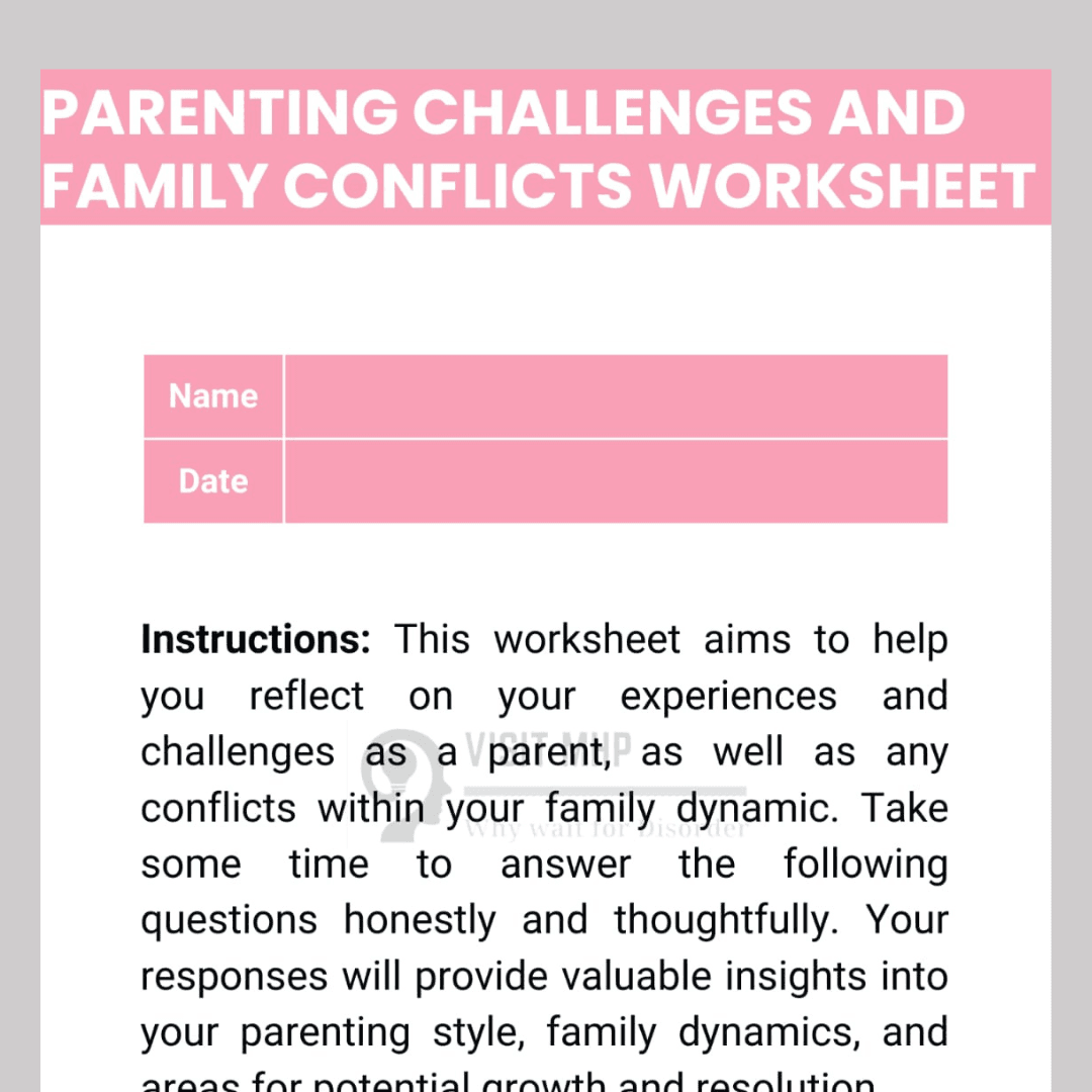The “Parenting Challenges and Family Conflicts Worksheet” is a resource designed to help individuals navigate difficult situations within the family dynamic. It prompts reflection on common parenting challenges, communication breakdowns, conflicts, and potential solutions. However, it’s important to note that this worksheet is not a substitute for professional help. For personalized support and guidance in addressing parenting challenges and family conflicts, consulting a qualified therapist or counselor is recommended.